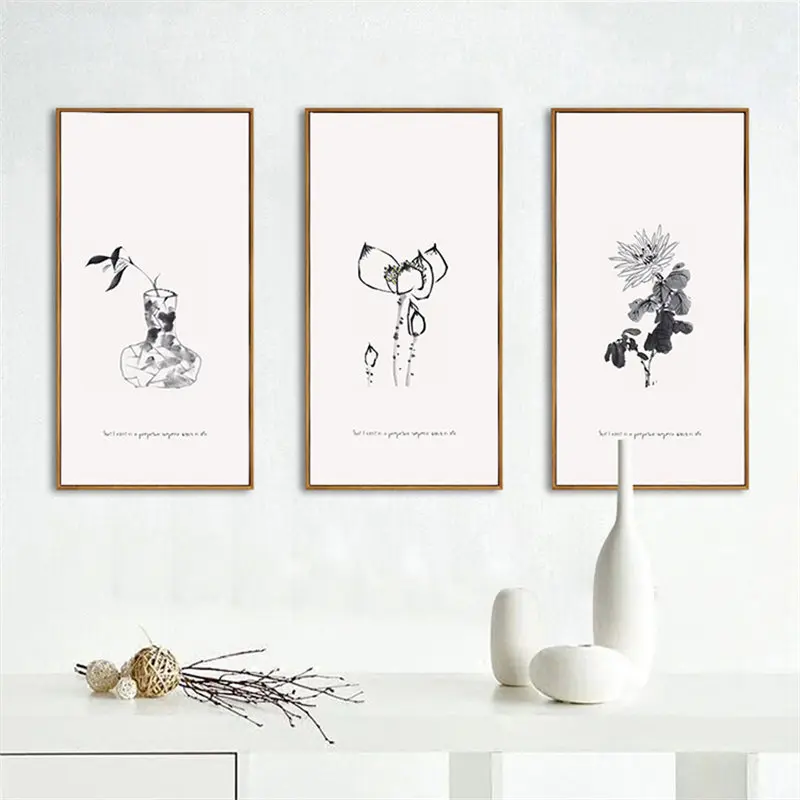 Black White Simple Flower Chinese Style Water Ink Canvas Painting Art